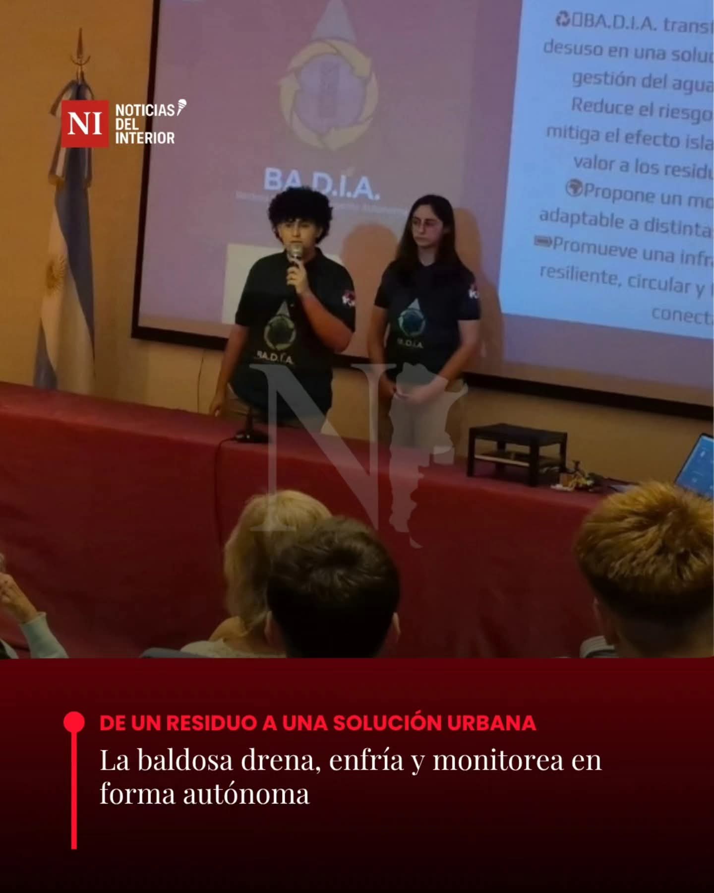 El equipo desarrolló B.A.D.I.A. (Baldosa Drenante Inteligente Autónoma), una baldosa fabricada con caucho reciclado que permite drenar y retener agua de lluvia, reducir la temperatura del pavimento y monitorear en tiempo real variables ambientales mediante sensores y un sistema automático de control.